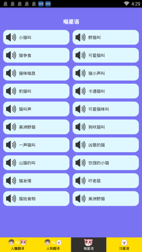 人猫人狗交流器是一款非常好玩的娱乐软件,使用人猫人狗交流器,就能将你的话通过软件来变成猫或者狗的语言,用来和你的宠物进行交流,非常的有趣哦。觉得这款软件还不错的朋友快来下载吧!