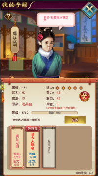 孩子的资质越高,成年后属性也越高,同时你还可以通过联姻(点击红娘)给孩子找伴侣,小俩口的属性都会算在你的势力值中,虽然不太多,但可以慢慢积累。