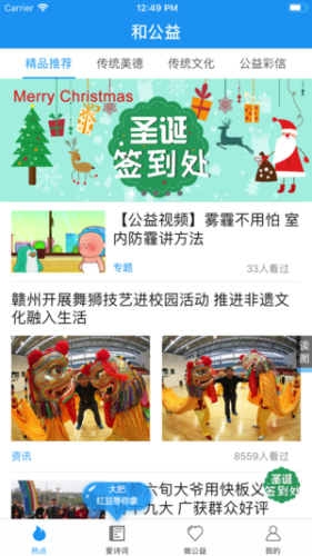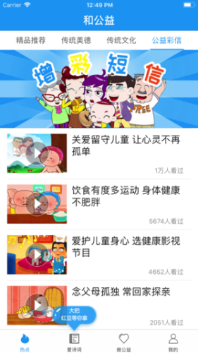 和公益客户端承载公益热点推荐、传统美德、传统文化等公益项目,用户通过为好人点赞、评议、好人好事举荐、诗词学习任务、分享有礼等活动,可以获得红豆积分,并在公益项目中进行红豆捐助和诗词大挑战。