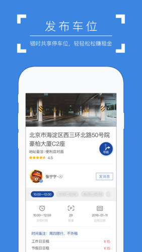 2、车位发布:空闲车位也赚钱!个人/企业车位主一秒发布优质车位,车位租金持续提现至个人账户!