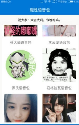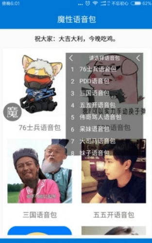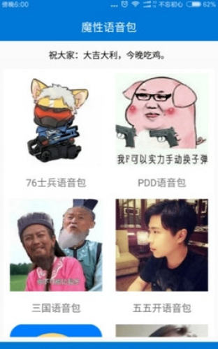 魔性语音包官方版是一款非常好用的语音包软件,这款软件包含多个吃鸡主播的语音包,能够让你在玩吃鸡游戏的时候拿语音包整蛊队友,欢迎各位感兴趣的朋友们下载试玩。
