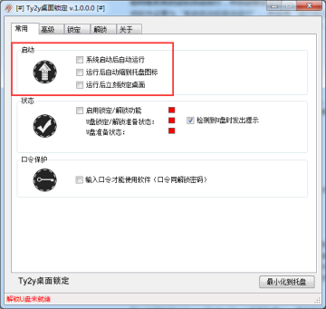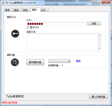一种为软件的主力模式,即使用U盘进行锁定和解锁。使用本方式时,需首先在“解锁”选项卡中“制作解锁U盘”(需插入U盘)然后在“常用”选项卡中“启用锁定\解锁功能”。之后即可使用。