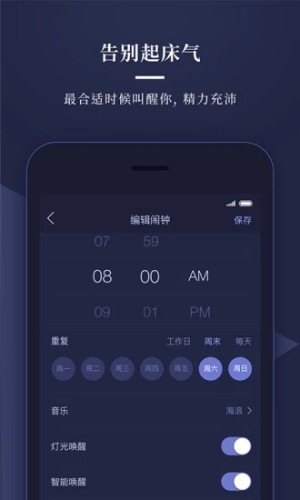在你浅睡眠的时候慢慢的将你唤醒,这是最自然和放松的闹钟唤醒机制,让你醒来后精力充沛。