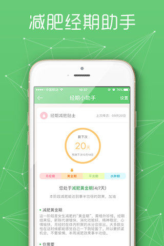 通过设置月经助手,美寸轻体会智能帮您计算出减肥月经期、减肥黄金期、减肥平淡期和减肥水肿期,让你又能得到大姨妈提醒,并能充分了解每月哪个阶段减肥效果最好。