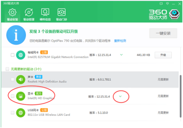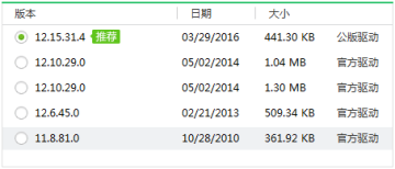 这里面就有显卡驱动的更新选项,找到显卡那一行,点击小红圈处,这时会弹出好多版本,类似如下图: