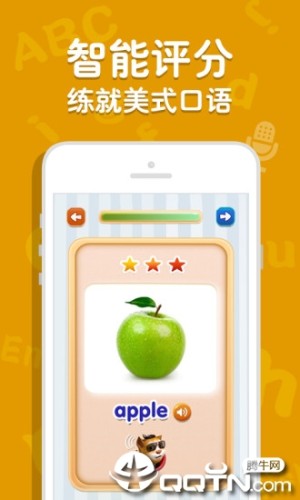 3、美式发音:每个单词都有标准美式发音,设计了发音练习以及人工智能评分的功能,让孩子经过练习,可以发出标准的美式口音。只有会说,才算是真正掌握。