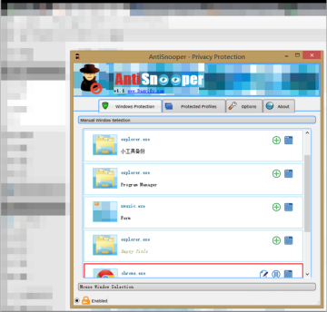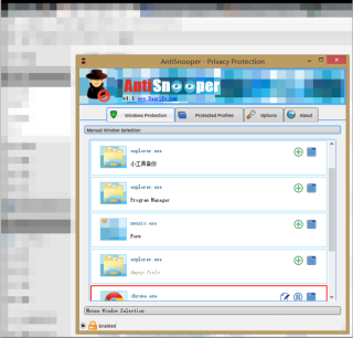 运行 AntiSnooper 后你可以选择从当前进程中选择要打码的窗口,或者使用鼠标去选择,在需要的窗口后面点击「加号」。