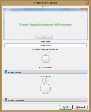 之后就进入打码效果设置窗口,「Protection Time-Out」 是设置窗口失焦多长时间后实现效果,如果想要马上的话就拖动转盘设置为 0,而 「Protection Type」 里是实现的形式,「Window Obscure」 是打码,「Obscure Factor」 是打码程度,下面的 「Window Screensaver」 则是设置为屏幕保护,这里就看个人喜好了。所有的设置效果都可以在上方的 「Preview」 预览里实时看到,最后点击 OK 设置完毕。
