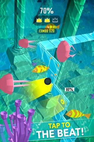 2、令人上瘾的节奏型游戏方式——一边聆听音乐、一边点击屏幕躲避障碍物;