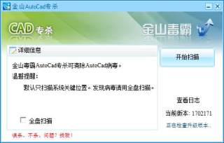 金山cad病毒专杀工具是目前最好用的cad病毒专杀工具。由于CAD病毒有别于传统病毒,致使目前很多杀毒软件对其无能为力,金山CAD病毒专杀工具可以帮您将CAD恢复到正常状态。
