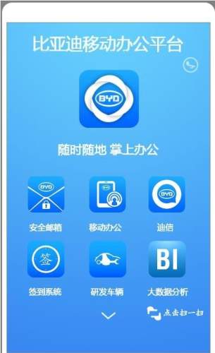 比亚迪移动办公APP已上线,包括安全邮箱、迪信、流程审批、新闻公告、考勤查询、工资查询、充值卡查询、通讯录查询、企业文化等功能,欢迎使用。