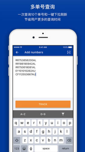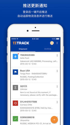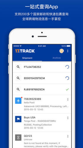 17TRACK--- 一个为跨境电子商务行业提供综合服务的平台。本版APP支持170多个邮政运输商,如:中国邮政、国际EMS,以及知名国际快递公司,同时也支持多家中国优质跨境物流商。