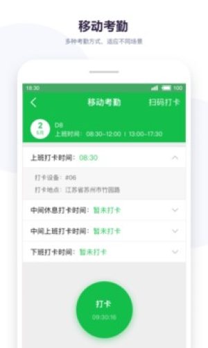2.移动考勤:提供蓝牙打卡、扫码打卡、定位打卡等功能,多种打卡方式,便捷移动考勤。
