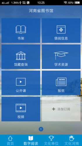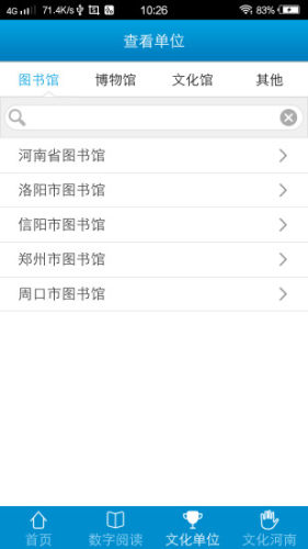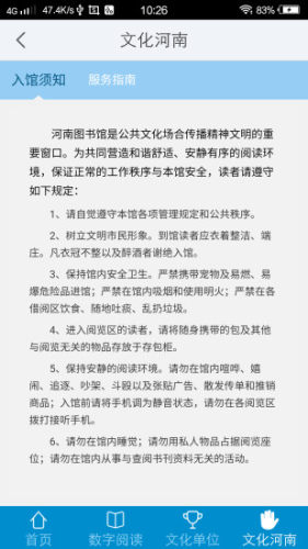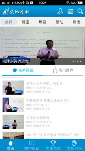 文化河南是河南省图书馆(文化信息资源共享工程河南省分中心)创办的河南省公共数字文化移动服务平台,是河南省公共图书馆、文化馆、博物馆、美术馆、科技馆、影剧院等公共文化单位文化信息发布、查询平台及数字化阅读平台。通过该平台用户可方便快捷的查询公共文化单位和社会文化机构举办的讲座、展览、活动、演出等多种文化资讯,同时,还可以阅读海量电子图书、报刊文章,浏览各类视频、多媒体资源库,享受河南省图书馆图书查询、续借、预约等移动业务办理、线上线下互动等多种方便快捷的公益服务。