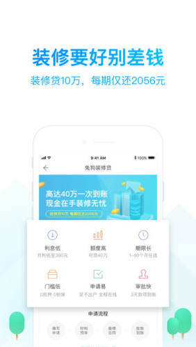 5、申请装修分期付款:兔狗装分期,0抵押0担保,极速放款分期还,可贷100万,每月仅还2056元。