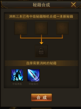 秘籍合成:玩家可以将三个任意中级秘籍合成随机一个新秘籍