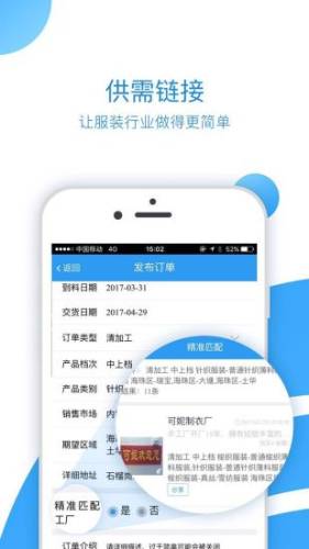 平台设工厂信用等级、生产专业、工厂规模、质量档次、工厂服务素质综合评估,强大的系统将精准匹配工厂加工生产,从而快速解决订单生产时机。