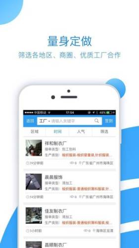 衣飞讯服装产业链共享平台,免费提供全国各地工厂、订单、招聘、求职、出租转让、工艺加工等信息,还有服装现货商城和布料商城。服装客户可在平台精准定位筛选全国各地最理想的服装生产区域、商圈快速加工。