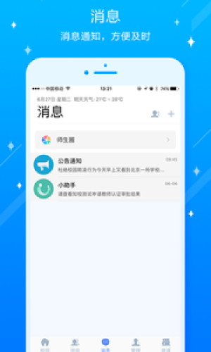 知校是一款专门面向学校的教育移动应用APP软件,它适用于在校的不同角色用户,教师、学生、家长等,强大多样的功能,覆盖了校内校外学习生活的方方面面。