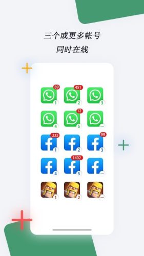 可以帮助您同时运行多个帐号,例如同时运行两个微信,一个用于工作对话,一个用于生活聊天。