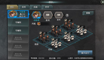 游戏内每名玩家最多同时上阵10支部队;部队需要配置1个主将,最多可配置2个副将、6种士兵,士兵可以混合搭配。副将的主动和被动技能会按一定比例转化为部队的战斗力。主将的天赋技能和被动技能都会完全计算进战斗力,不打折扣,并且主将的属性直接影响部队,如武力、智力、暴击、命中、带兵量和出手速度等。不同兵种之间有相克关系;骑兵克步兵,步兵克弓兵,弓兵克器械,器械克骑兵。