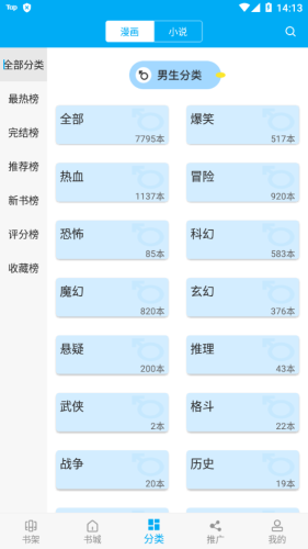 自带书城,书城内的小说、漫画各种题材超级丰富