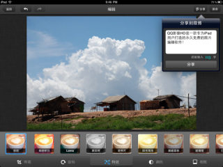QQ影像HD 1.3.0也正式迎来“云”时代:新增云同步功能,一键完成iPad、pc照片同步;支持分享到新浪微博,随时向好友晒靓照;带来全新视觉风格,清浅黄绿,格子铅笔;新增4个精美的滤镜为你打造百变形象,随便点点都有惊喜哦~