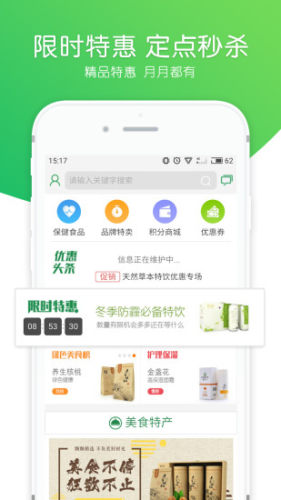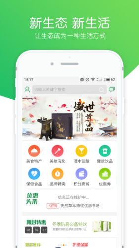 生态生活是一款手机购物app,为用户提供供健康、环保、生态产品,具有美食产品、美妆洗化、酒水佳酿、限时特惠、会员积分商城等多个功能板块,感兴趣的朋友赶快来下载吧!