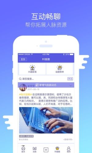 科界是专为广大科技人才打造的知识分享与聊天交流app,你可以在这里结识更多志同道合的朋友,拓展人脉资源,并且每天及时发布科技资讯,助你了解科技界的最新热点。