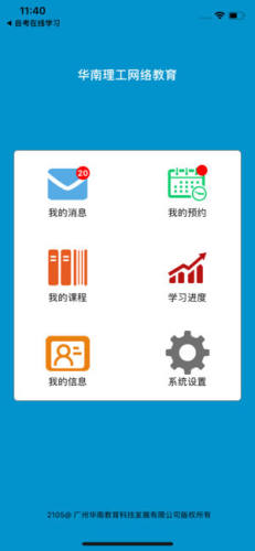 提供学生个人信息查看,学习进度查询,在线课件学习,考试预约等功能。