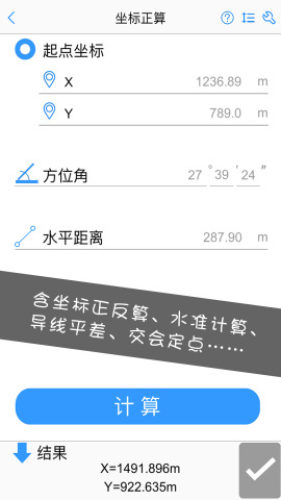 便捷的测量计算器,包括控制测量导线计算、水准高程的平差、坐标正反算、交会定点、角度转换……