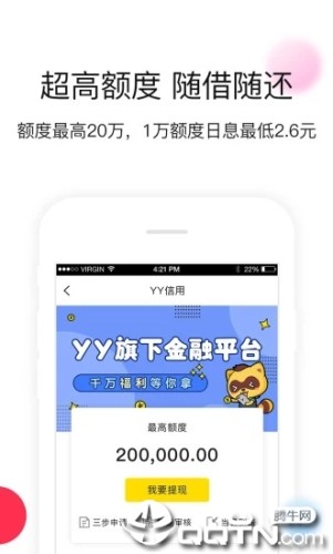 YY信用,一款由YY欢聚时代官方打造的掌上便捷借款应用。这里为用户提供各种专业的掌上借款服务功能,轻松线上申请,便捷借款,极速到账,让你从此借款无忧!