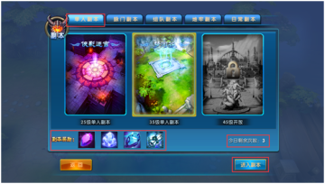 单人副本四张地图,分别在等级达到25级、35级、45级、55级时开放进入,玩家可以根据自己的需求选择进入副本地图。