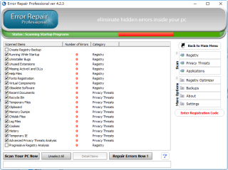 Error Repair 是一款电脑错误扫描修复工具,比如可以检查注册表的错误并且进行修复电脑95%隐藏错误/将你电脑上的隐藏错误给找出来!让这软体扫描你的电脑并且发现它里面潜伏多少错误?并立即修复他们!