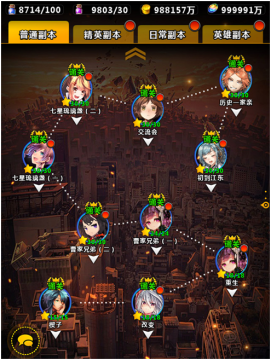 游戏中玩家将化身主公踏上战斗征程,将会参加各个章节的战斗,每个副本分为不同的章节挑战不同的武将BOSS,通过后以获得道具和奖励。要特别注意的是,只有玩家达到100级之后才能解锁精英关卡。