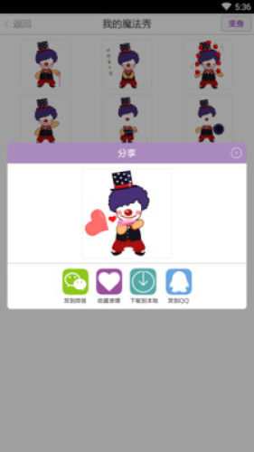 只需要左右滑动,点击,就可以完成形象自定义。只需点击表情就可以选择分享平台咯。