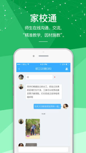 以“互联网+教育”为特色,为学校提供微门户、家校互动、学生成长等功能的全新的家校互动平台。老师可以发作业、发通知、发投票、发活动等,家长可以与老师实时沟通,可以了解还在在学校的各种信息。