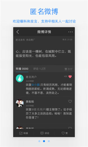 明星们可以随时随地发布他们的所见、所闻、所想。粉丝们可以第一时间了解明星的动态了粉丝之间也可以随时交流,您也可以成为粉丝中的“明星”!