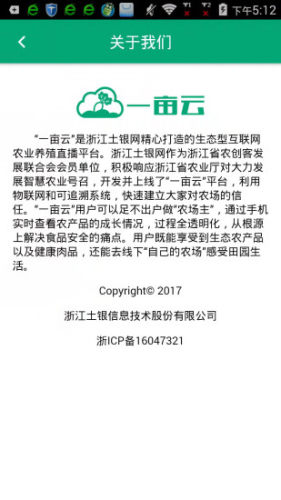 “一亩云”是浙江土银网精心打造的生态型互联网农业养殖直播平台。浙江土银网作为浙江省农创客发展联合会会员单位,积极响应浙江省农业厅对大力发展智慧农业号召,开发并上线了“一亩云”平台,利用物联网和可追溯系统,快速建立大家对农场的信任。“一亩云”用户可以足不出户做“农场主”,通过手机实时查看农产品的成长情况,过程全透明化,从根源上解决食品安全的痛点。用户既能享受到生态农产品以及健康肉品,还能去线下“自己的农场”感受田园生活。