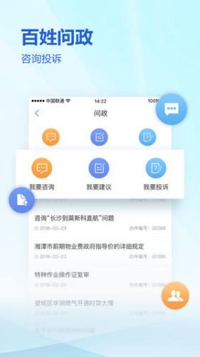 权威的政务平台,联通市民与政府沟通的桥梁。百姓事网上办,操作简单,回复嘿快,有事大家谈,汇聚民智,共筑幸福湖南。