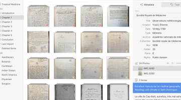 Tropy是一款免费的开源软件,允许您组织和描述研究材料的照片。 将照片导入Tropy之后,您可以将照片合并到项目中(例如,将信件的三页的照片合并到单个项目中),并将照片合并到列表中。 您还可以描述照片的内容。 Tropy使用具有多个字段的可定制元数据模板来显示照片内容的不同属性,例如标题,日期,作者,包装盒,文件夹,收藏夹和存档。 您可以在模板中为单张照片输入信息,或者选择多张照片并批量添加或编辑信息。 Tropy还可以让你标记照片。 您还可以为照片添加一个或多个笔记; 笔记可以是文档的转录。 搜索功能可让您使用元数据,标签和便笺在照片中查找素材。