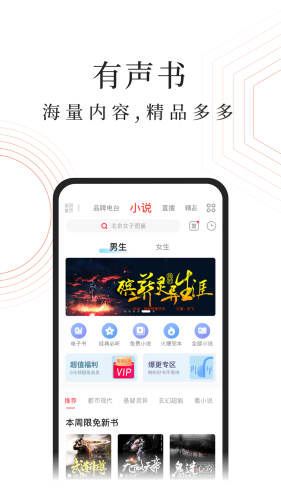 涵盖了有声小说、相声小品、新闻、音乐、脱口秀、历史、情感、财经、儿童、评书、健康、教育、文化、科技、电台等三十余个分类。