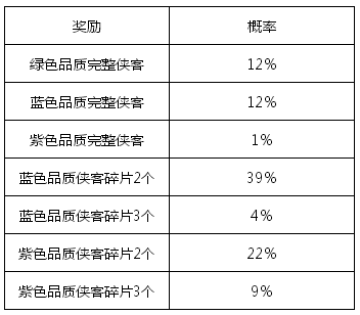 注:购买10次必得的完整紫色侠客不在上表统计概率范围内。