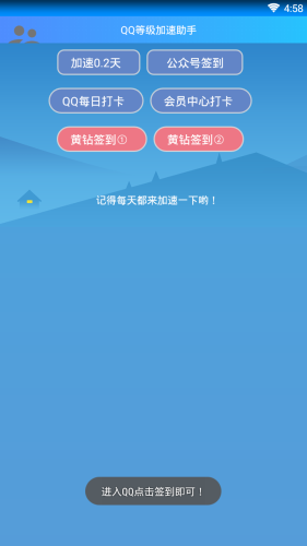 QQ等级加速助手是一款针对qq的多功能手机助手,使用QQ等级加速助手app,就能为你的qq免费加速,还有各种签到功能等你来体验哦,有兴趣的小伙伴可以下载试试看哦!