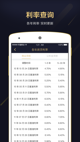 4、数据全面,选择自由,为您提供央行近几年执行的全部贷款利率,您还可以同时对折扣倍数进行自定义,九折、七折自由随心。除此之外,计算结果还包含了还贷后新的还款计划、新的月供金额、新的还贷期限,让您一眼看天下。
