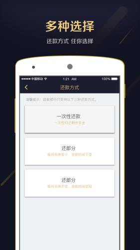 2、支持三种贷款归还方式,与银行同步,分别为提前全部还完、提前部分归还[月供不变,期数减少]、提前部分归还[期数不变,月供减少],方便您的选择。