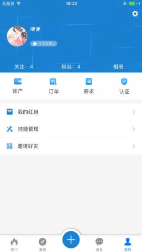 发现栏目包含服务和需求两个小的模块,服务模块是发布的技能服务;需求是附近用户发布的需求信息。