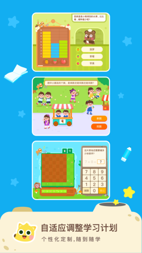 宝宝个性学习:根据儿童学习认知规律研发的数学练习评估策略,分析宝宝每次数学练习,根据宝宝累计练习情况个性化推送下次数学练习。