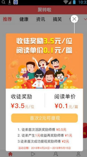 新人注册即送1元,文章单价1毛;有效收徒3.5元/位