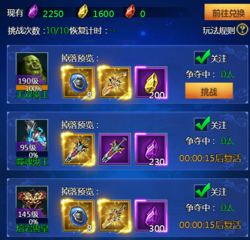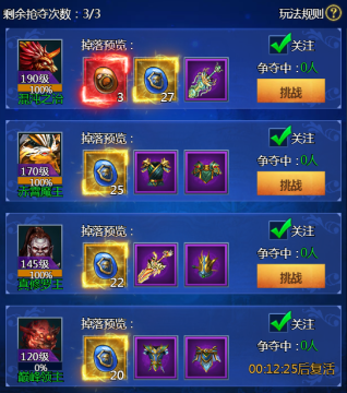 玩家每2小时获得一次BOSS的挑战次数,最多可以积累10次。每个BOSS被击杀后有一定的刷新时间,刷新后才可以进行挑战。所以BOSS刷新后尽快去进行击杀吧